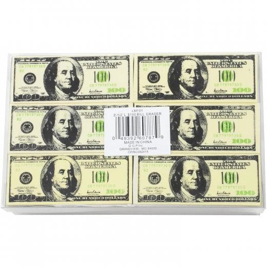 $100 Bill Erasers (36 Count) by CarnivalSource.com! Fix any mistake with this $100 bill eraser. Erasers are a fun addition to a goody bag or to hand out as a church or school carnival prize. 36 Pieces per unit. Find more great items like this in our School Supplies Erasers category here at CarnivalSource.com. This 36-count box of $100 Bill Erasers by CarnivalSource.com is the perfect addition to any goody bag or school carnival prize. Each eraser measures 2 1/2 inches long and ships from our Missouri warehouse within one business day. Ideal for fixing any mistake, these erasers are packaged in a 36 Piece Acetate Box. Shop our School Supplies Erasers category for more great items!