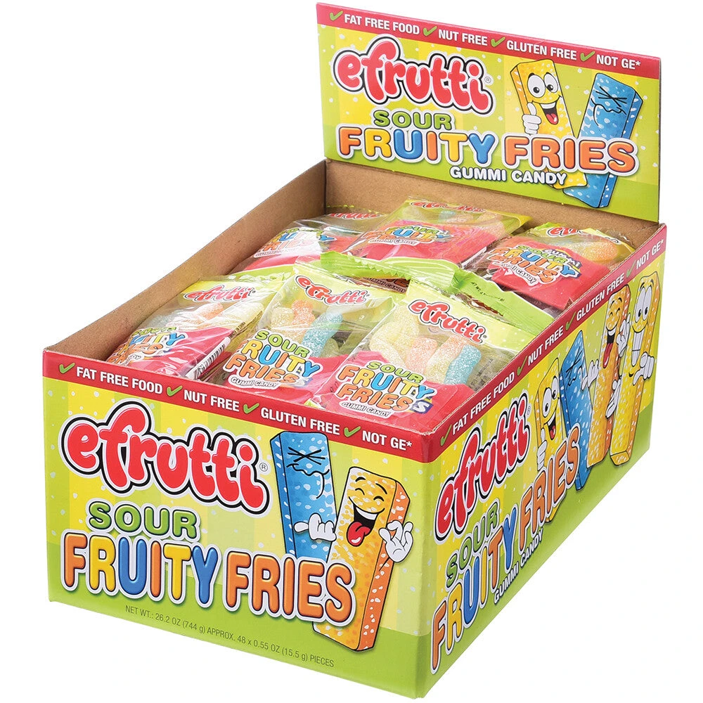 Sour, gummy and fruity fries. Lemon, Apricot and Raspberry flavors. Nut free, gluten free, Fat Free. Efrutti Sour Fruity Fries are a delicious, sour and gummy treat in three mouth-watering flavors: Lemon, Apricot, and Raspberry. Not only are they free of nuts, gluten, and fat, but each package contains five randomly assorted fries in a polybag package. Perfect for a snack or party favor!